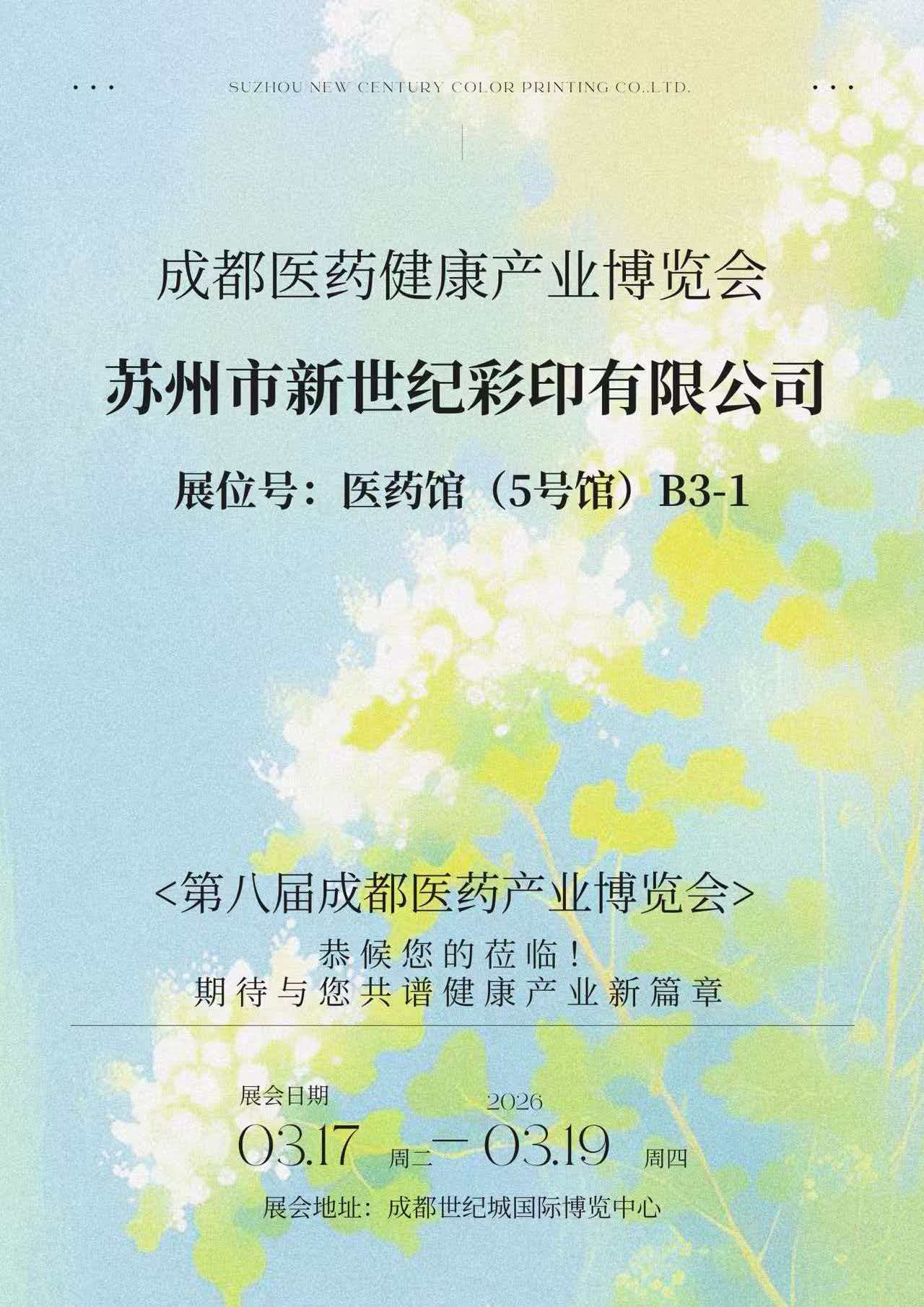 2026年3月17日から19日まで、第8回成都医療健康産業博覧会が成都世紀城国際会議展示センターで盛大に開催された。 蘇州新世紀カラー印刷有限公司(以下、「新世紀印刷」)は、医薬品包装分野における最新の成果を2019年9月に発表した。 ブースB3-1 製薬ホール(ホール5)に出展し、医薬品包装印刷、構造設計、コンプライアンスサービスなどの総合力を総合的に紹介します。多くの製薬会社や業界の専門家が集まり、立ち止まって意見を交換しました。